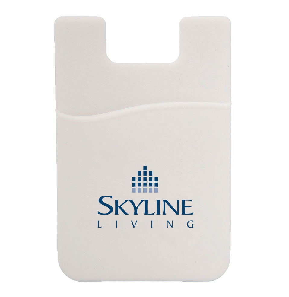 Silicone smart wallet with 3M adhesive tap measuring 1¾ × 1½. Holds two credit, debit, or ID cards. Will not demagnetize your cards. Phone not included.